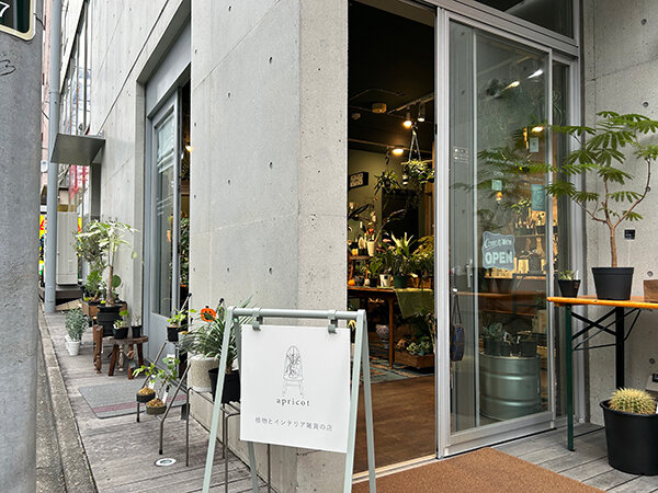 コーヒーとお菓子を楽しんだあとは、植物とインテリア雑貨のお店を見に行ってみましょう。「apricot」は「植物との暮らし」をテーマに、さまざまな観葉植物を販売する専門店。初心者にも育てやすいものから、枝ぶりがよく個性的なものまでを厳選しています。